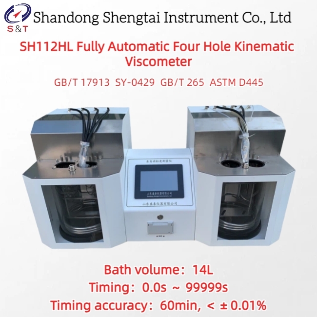 The SH112HL fully automatic four hole kinematic viscosity tester is designed and manufactured in accordance with the requirements specified in the Chinese standards GB/T11137 "Dynamic Viscosity Method for Dark Petroleum Products" and SY2409 "Dynamic Viscosity Method for Dark Petroleum Products"暗黒な石油製品と重油の測定に適しており,GB/T265とUbbelohde粘度測定にも適合します.